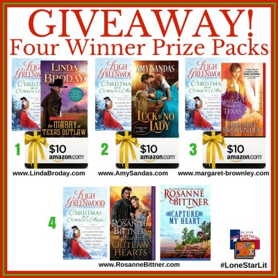 Four Winners will each get a prize pack which includes Christmas in a Cowboy’s Arms + another book(s) by one of the authors. Three of the packs will also include a $10 Amazon Gift Card.